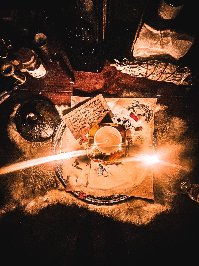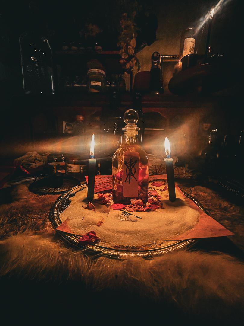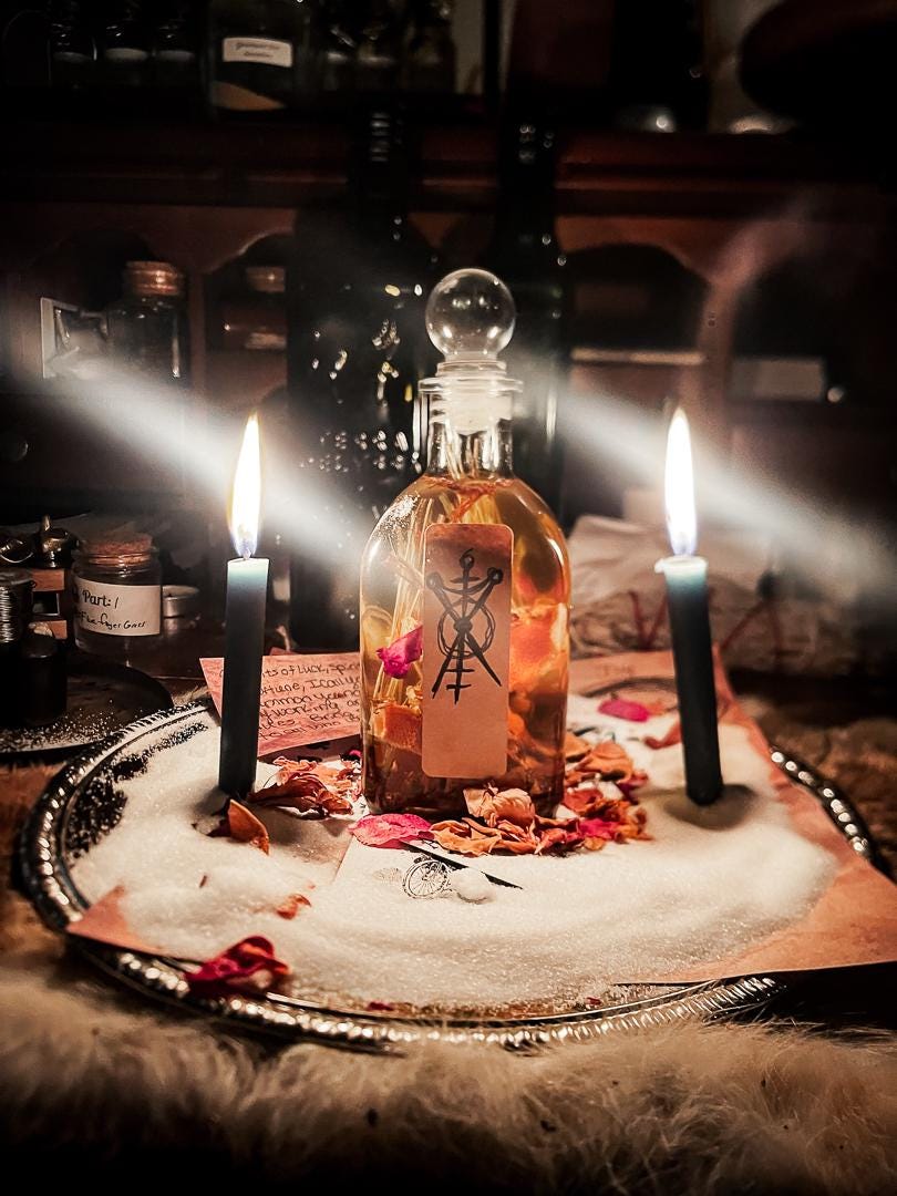 This oil is slow-infused and repeatedly charged through ritual work, spell sessions, and spirit-focused enchantments to awaken its role as a living luck-working tool, not a passive cosmetic oil.